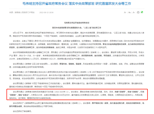 2022年8月15日下午,省長毛偉明主持召開省政府常務(wù)會議,研究審議通過了省咨詢公司編制的《湖南省冷鏈物流體系建設(shè)行動方案(2022-2025年)》課題,會議指出要結(jié)合我省冷鏈物流的流量、流向、流效,構(gòu)建“設(shè)施網(wǎng)”,拓寬“運輸線”,打造“創(chuàng)新鏈”,強化“支撐點”,力爭到2025年,全省冷庫容量達(dá)到1500萬立方米,基本建成以長株潭地區(qū)為核心區(qū)塊,以湘南、洞庭湖、大湘西地區(qū)為區(qū)域中心,布局合理、結(jié)構(gòu)優(yōu)化、運行高效、管理規(guī)范的現(xiàn)代冷鏈物流體系。