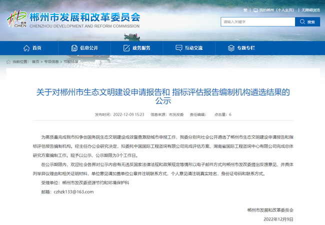 2022年12月9日,省咨詢公司憑借在生態(tài)文明領(lǐng)域的杰出業(yè)績和豐富的課題研究經(jīng)驗,聯(lián)合中國國際工程咨詢有限公司成功中標(biāo)郴州市生態(tài)文明建設(shè)總體研究方案和評估方案。
